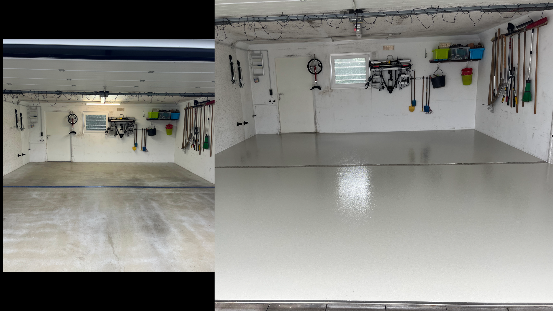 Durch eine professionelle Epoxidharzbeschichtung wurde der alte Betonboden in einen rutschfesten , pflegeleichten und modernen Garagenboden verwandelt. Das Ergebnis: mehr Glanz, höhere Widerstandsfähigkeit und eine saubere, aufgeräumte Optik.